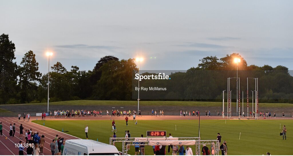 18 August 2015; Frank Greally, who set a record for the 10,000M 45 years ago on this day, pictured as he crosses the finish line after running around Morton Stadium for 30.17 - the record time set on the night. Frank Greally's Gratitude Run. Morton Stadium, Dublin Picture credit: Ray McManus / SPORTSFILE