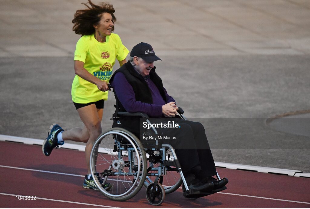18 August 2015; Mary B. Jennings pushes Ray McBride for the last lap as Frank Greally, who set a record for the 10,000M 45 years ago on this day, runs around Morton Stadium for 30.17 - the record time set on the night. Frank Greally's Gratitude Run. Morton Stadium, Dublin Picture credit: Ray McManus / SPORTSFILE