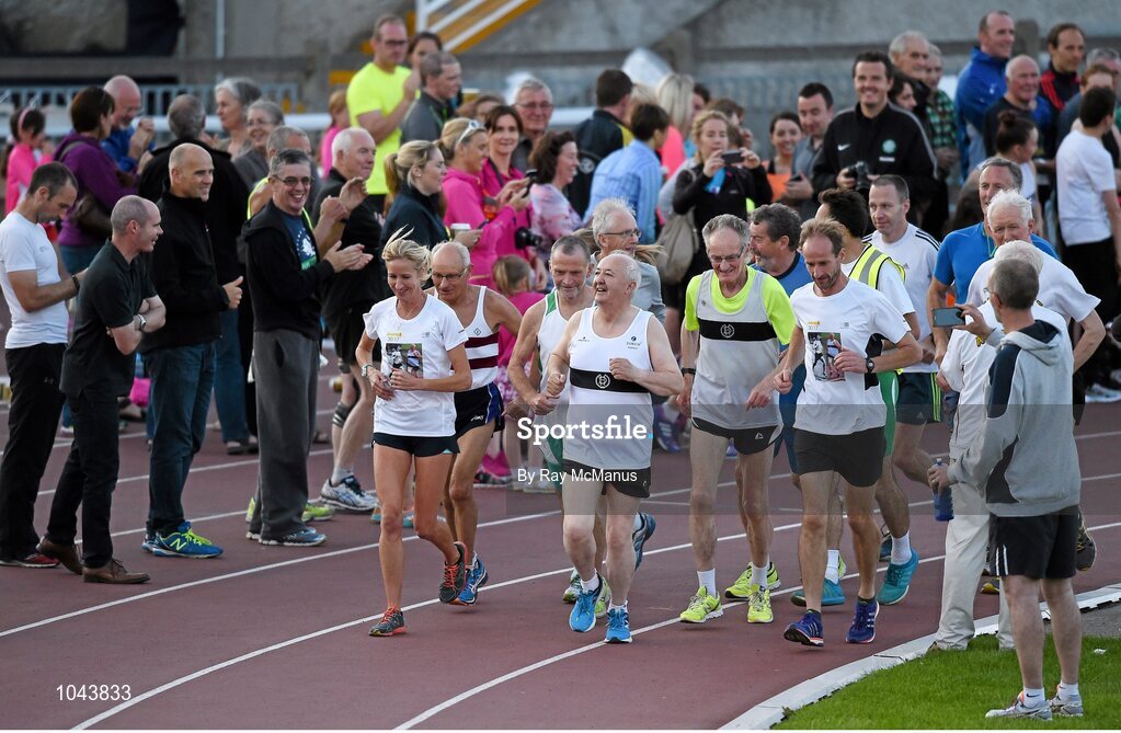 18 August 2015; Athletes including Des McGann, Catherina McKiernan, John Treacy, Bobby King, Neil Cusack, Sean Webb, Jim McNamara, Feidhlim Kelly, Sean Webb, David Carrie, and Maurice Ahern run with Frank Greally, who set a record for the 10,000M 45 years ago on this day, pictured as he runs around Morton Stadium for 30.17 - the record time set on the night. Frank Greally's Gratitude Run. Morton Stadium, Dublin Picture credit: Ray McManus / SPORTSFILE
