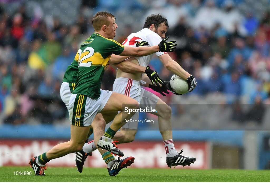 23 August 2015; Barry Tierney, Tyrone, is fouled by Killian Young, left, and Fionn Fitzgerald, Kerry, which resulted in a penalty. GAA Football All-Ireland Senior Championship, Semi-Final, Kerry v Tyrone. Croke Park, Dublin. Picture credit: Ramsey Cardy / SPORTSFILE
