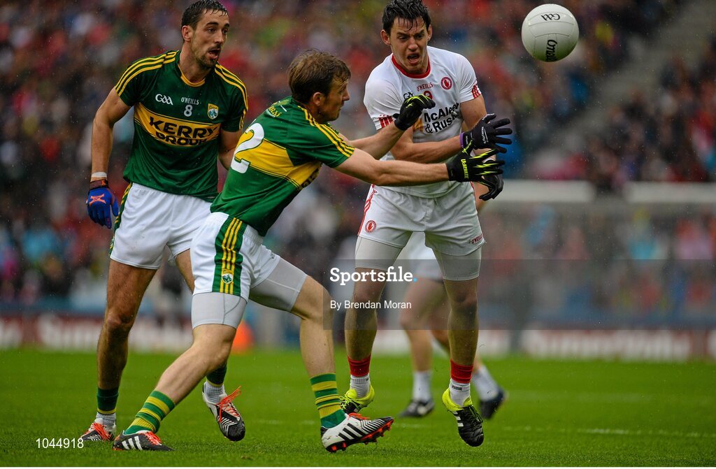 23 August 2015; Mattie Donnelly, Tyrone, in action against Anthony Maher and Donnchadh Walsh, Kerry. GAA Football All-Ireland Senior Championship, Semi-Final, Kerry v Tyrone. Croke Park, Dublin. Picture credit: Brendan Moran / SPORTSFILE