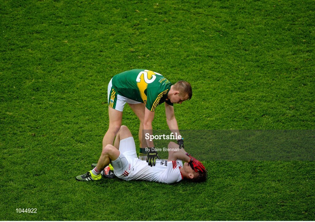 23 August 2015; Fionn Fitzgerald, Kerry, consoles Mark Bradley, Tyrone, after the game. GAA Football All-Ireland Senior Championship, Semi-Final, Kerry v Tyrone. Croke Park, Dublin. Picture credit: Dáire Brennan / SPORTSFILE