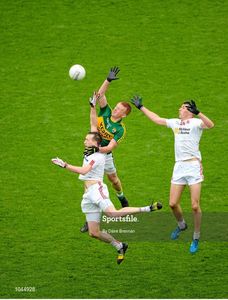 23 August 2015; Johnny Buckley, Kerry, in action against Colm Cavanagh, left, and Pádraig McNulty, Tyrone. GAA Football All-Ireland Senior Championship, Semi-Final, Kerry v Tyrone. Croke Park, Dublin. Picture credit: Dáire Brennan / SPORTSFILE