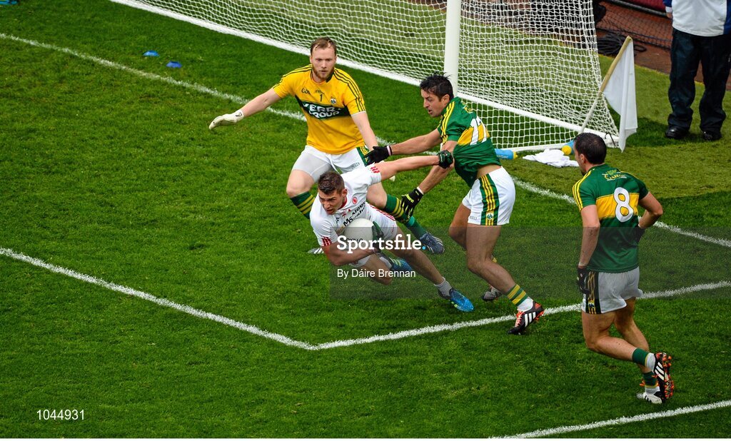 23 August 2015; Pádraig McNulty, Tyrone, in action against Aidan O'Mahony, Kerry. McNulty received a yellow card for diving from this incident. GAA Football All-Ireland Senior Championship, Semi-Final, Kerry v Tyrone. Croke Park, Dublin. Picture credit: Dáire Brennan / SPORTSFILE