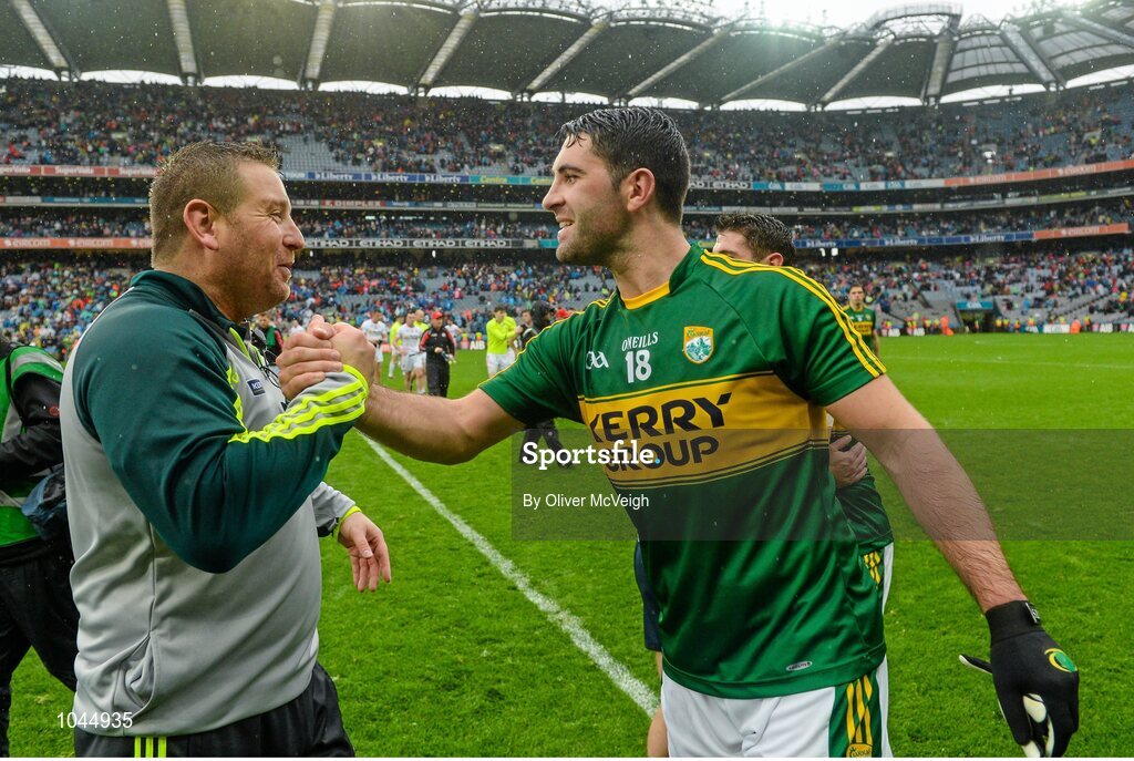 23 August 2015; Brian Sheehan, Kerry, right, celebrates with Cian O'Neill, Kerry trainer, after the game. GAA Football All-Ireland Senior Championship, Semi-Final, Kerry v Tyrone. Croke Park, Dublin. Picture credit: Oliver McVeigh / SPORTSFILE