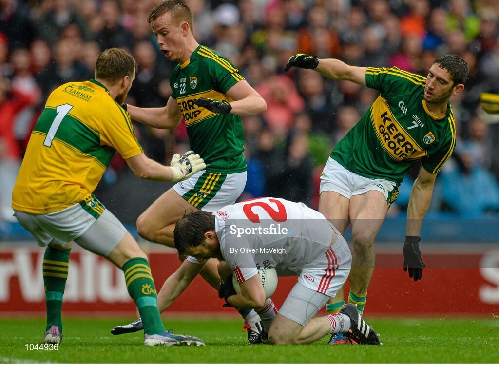 23 August 2015; Barry Tierney, Tyrone, being taken down for his side's penalty with Brendan Kealy, Fionn Fitzgerald and Killian Young, Kerry, surrounding him. GAA Football All-Ireland Senior Championship, Semi-Final, Kerry v Tyrone. Croke Park, Dublin. Picture credit: Oliver McVeigh / SPORTSFILE
