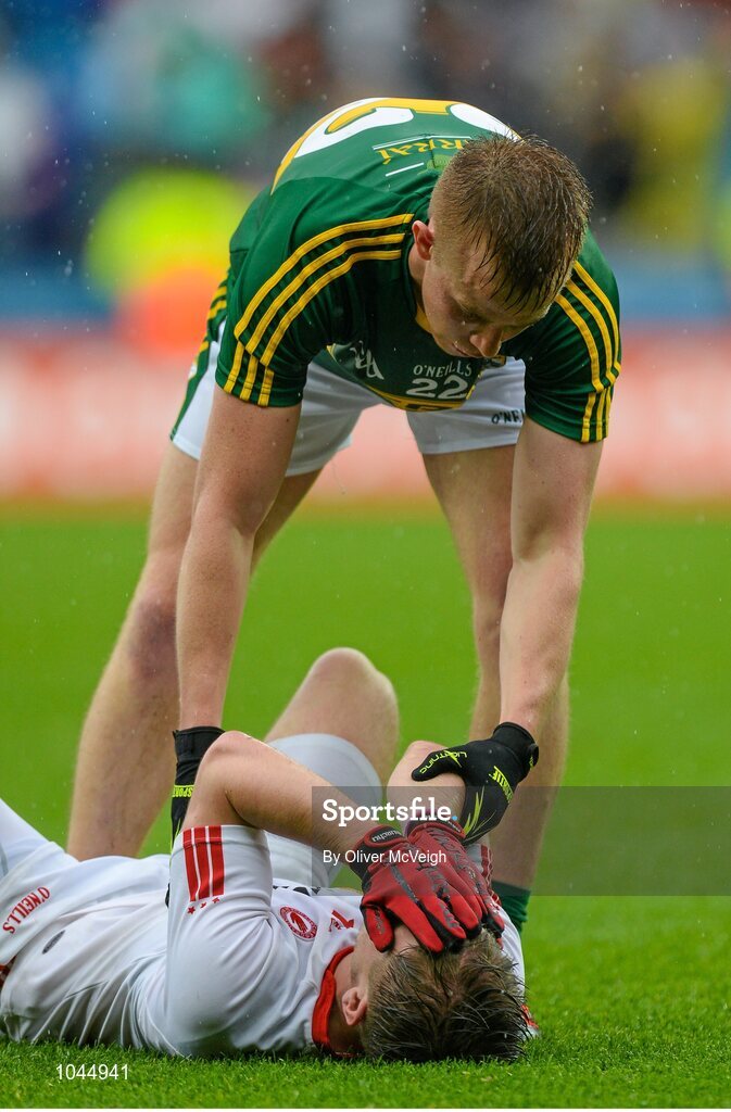 23 August 2015; Fionn Fitzgerald, Kerry, consoles Mark Bradley, Tyrone, after the final whistle. GAA Football All-Ireland Senior Championship, Semi-Final, Kerry v Tyrone. Croke Park, Dublin. Picture credit: Oliver McVeigh / SPORTSFILE
