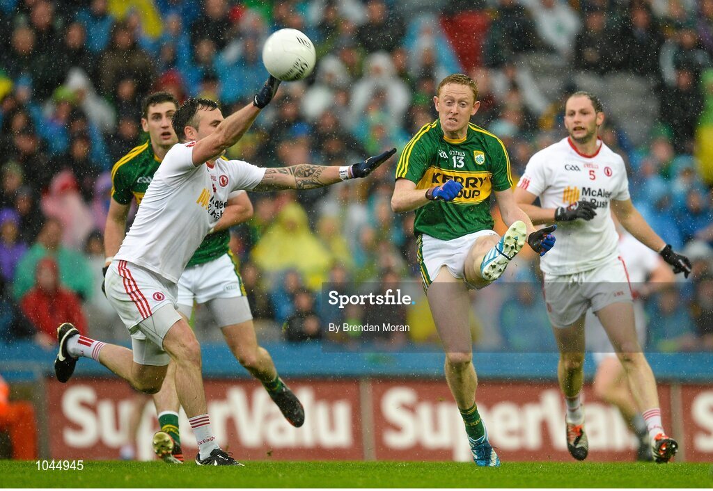 23 August 2015; Colm Cooper, Kerry, kicks a point despite the best efforts of Cathal McCarron, Tyrone. GAA Football All-Ireland Senior Championship, Semi-Final, Kerry v Tyrone. Croke Park, Dublin. Picture credit: Brendan Moran / SPORTSFILE