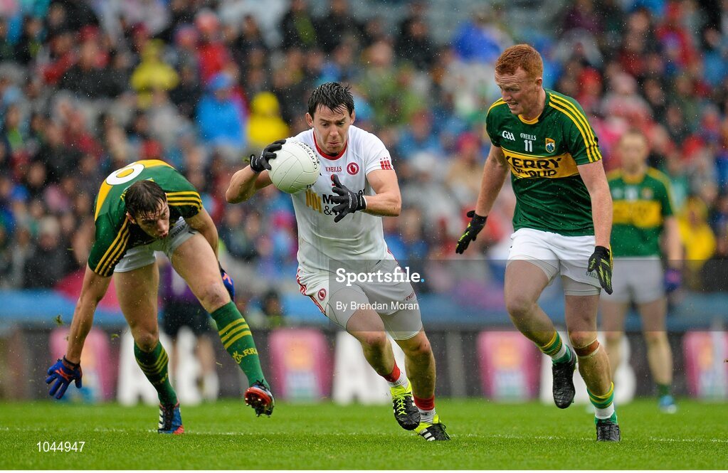 23 August 2015; Mattie Donnelly, Tyrone, in action against David Moran, left, and Johnny Buckley, Kerry. GAA Football All-Ireland Senior Championship, Semi-Final, Kerry v Tyrone. Croke Park, Dublin. Picture credit: Brendan Moran / SPORTSFILE