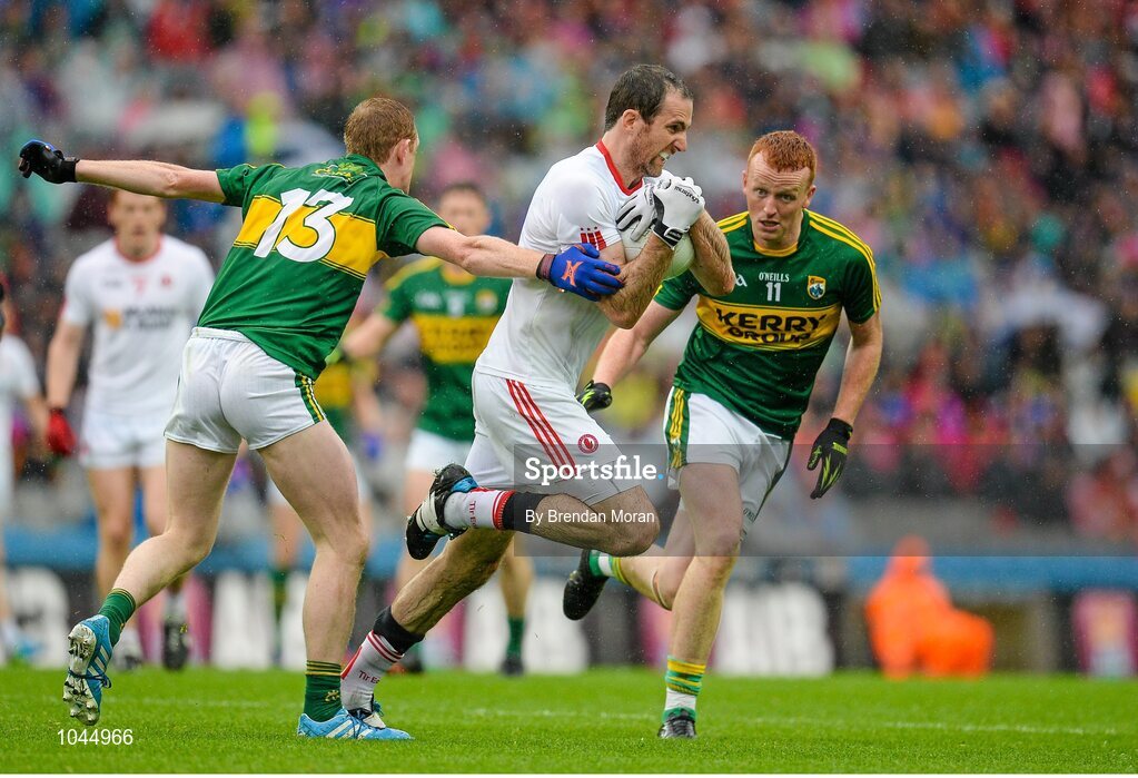 23 August 2015; Justin McMahon, Tyrone, in action against Colm Cooper, left, and Johnny Buckley, Kerry. GAA Football All-Ireland Senior Championship, Semi-Final, Kerry v Tyrone. Croke Park, Dublin. Picture credit: Brendan Moran / SPORTSFILE