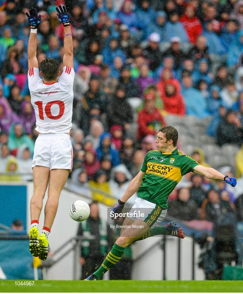 23 August 2015; David Moran, Kerry, kicks for a point despite the best efforts of Tiernan McCann, Tyrone. GAA Football All-Ireland Senior Championship, Semi-Final, Kerry v Tyrone. Croke Park, Dublin. Picture credit: Brendan Moran / SPORTSFILE