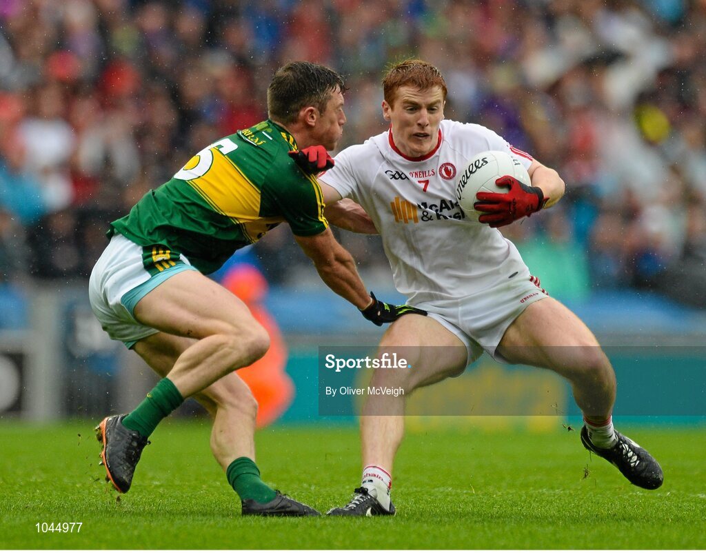 23 August 2015; Peter Harte, Tyrone, in action against Peter Crowley, Kerry. GAA Football All-Ireland Senior Championship, Semi-Final, Kerry v Tyrone. Croke Park, Dublin. Picture credit: Oliver McVeigh / SPORTSFILE
