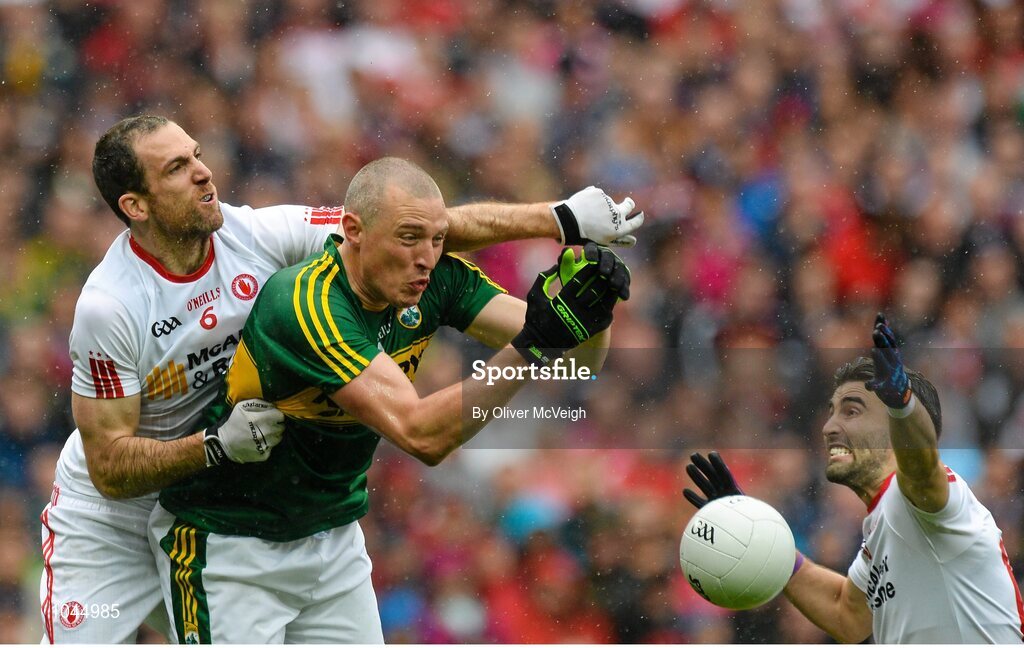 23 August 2015; Kieran Donaghy, Kerry, in action against Justin McMahon and Tiernan McCann, Tyrone. GAA Football All-Ireland Senior Championship, Semi-Final, Kerry v Tyrone. Croke Park, Dublin. Picture credit: Oliver McVeigh / SPORTSFILE