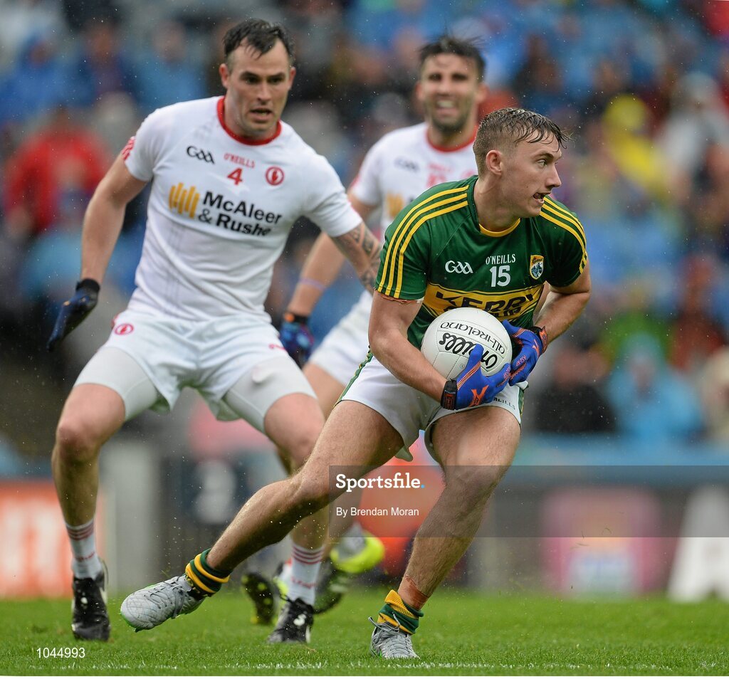 23 August 2015; James O'Donoghue, Kerry, in action against Cathal McCarron, Tyrone. GAA Football All-Ireland Senior Championship, Semi-Final, Kerry v Tyrone. Croke Park, Dublin. Picture credit: Brendan Moran / SPORTSFILE