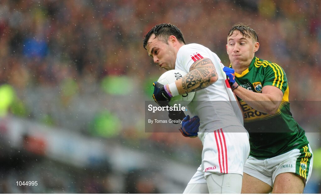 23 August 2015; Cathal McCarron, Tyrone, in action against James O'Donoghue, Kerry. GAA Football All-Ireland Senior Championship, Semi-Final, Kerry v Tyrone. Croke Park, Dublin. Picture credit: Tomas Greally / SPORTSFILE