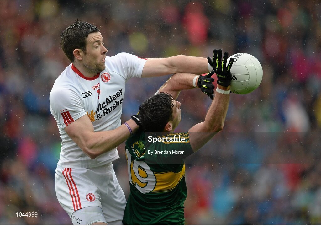 23 August 2015; Conor Clarke, Tyrone, in action against Paul Geaney, Kerry. GAA Football All-Ireland Senior Championship, Semi-Final, Kerry v Tyrone. Croke Park, Dublin. Picture credit: Brendan Moran / SPORTSFILE