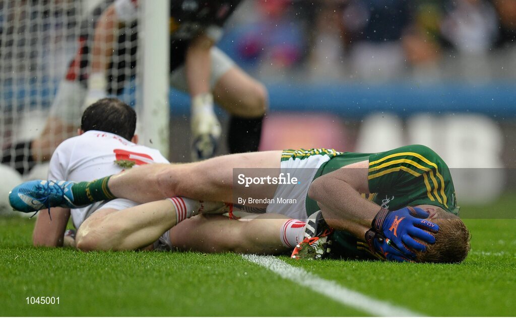 23 August 2015; Colm Cooper, Kerry, lies injured after a challenge from Ronan McNabb, Tyrone. GAA Football All-Ireland Senior Championship, Semi-Final, Kerry v Tyrone. Croke Park, Dublin. Picture credit: Brendan Moran / SPORTSFILE