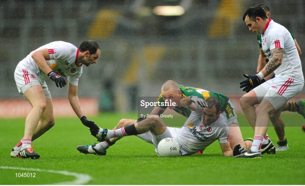 23 August 2015; Kieran Donaghy, Kerry, in action against, from left, Tyrone's Ronan McNabb, Justin McMahon and Cathal McCarron. GAA Football All-Ireland Senior Championship, Semi-Final, Kerry v Tyrone. Croke Park, Dublin. Picture credit: Tomas Greally / SPORTSFILE