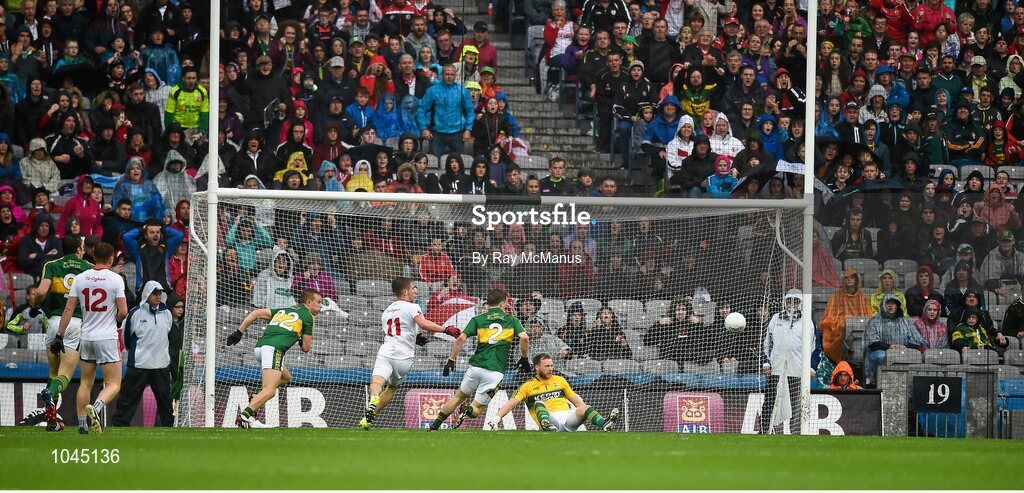 23 August 2015; The Kerry goalkeeper Brendan Kealy and his team-mates watch the flight of the ball after he had saved a shot from Tyrone's Mark Bradley, 11, in the 43rd minute. GAA Football All-Ireland Senior Championship, Semi-Final, Kerry v Tyrone. Croke Park, Dublin. Picture credit: Ray McManus / SPORTSFILE