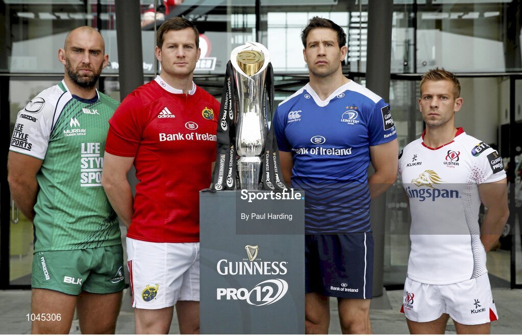 24 August 2015: Pictured are, from left to right, John Muldoon, Connacht, Dennis Hurley, Munster, Kevin McLaughlin, Leinster, and Paul Marshall, Ulster, in attendance at the Guinness PRO12 2015/16 Season Launch. Diageo HQ, Lakeside Drive, Park Royal, London, England. Picture credit: Paul Harding / SPORTSFILE