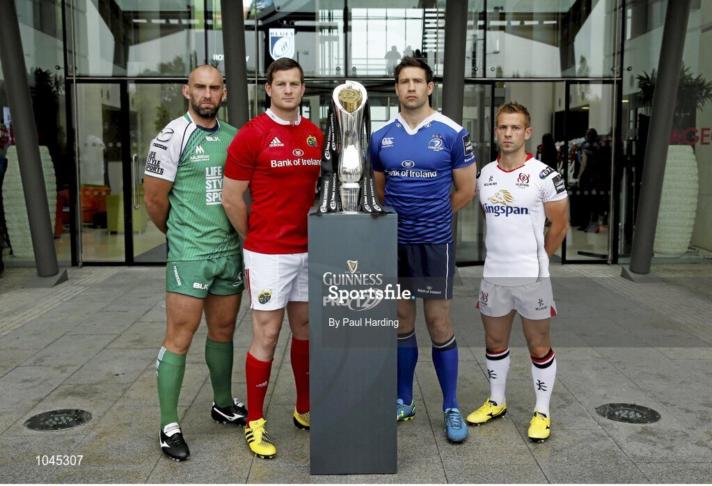 24 August 2015: Pictured are, from left to right, John Muldoon, Connacht, Dennis Hurley, Munster, Kevin McLaughlin, Leinster, and Paul Marshall, Ulster, in attendance at the Guinness PRO12 2015/16 Season Launch. Diageo HQ, Lakeside Drive, Park Royal, London, England. Picture credit: Paul Harding / SPORTSFILE