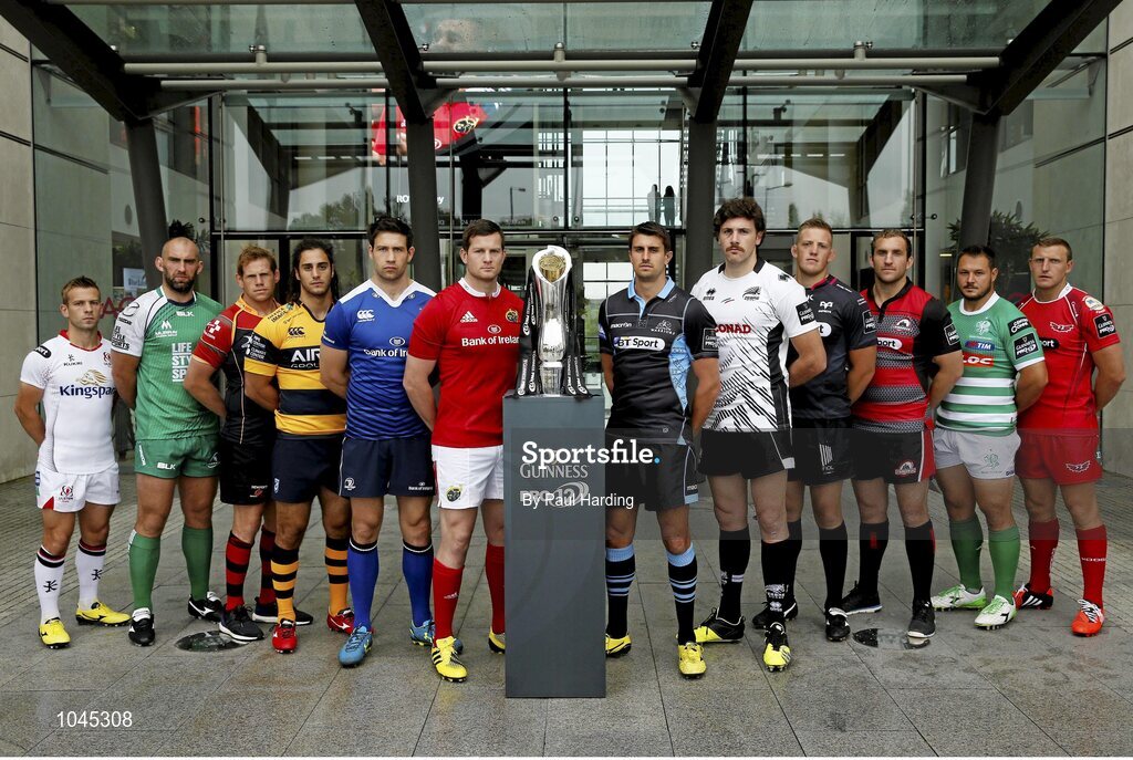 24 August 2015: Pictured are, from left to right, Paul Marshall, Ulster, John Muldoon, Connacht, Thomas Rhys Thomas, Dragons, Josh Navidi, Cardiff Blues, Kevin McLaughlin, Leinster, Dennis Hurley, Munster, Peter Murchie, Glasgow Warriors, George Biagi, Zebre, Lloyd Ashley, Ospreys, Mike Coman, Edinburgh, Alberto Demarch,Treviso, and Hadleigh Parkes, Scarletts, in attendance at the Guinness PRO12 2015/16 Season Launch. Diageo HQ, Lakeside Drive, Park Royal, London, England. Picture credit: Paul Harding / SPORTSFILE