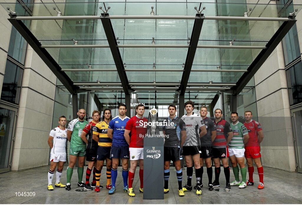 24 August 2015: Pictured are, from left to right, Paul Marshall, Ulster, John Muldoon, Connacht, Thomas Rhys Thomas, Dragons, Josh Navidi, Cardiff Blues, Kevin McLaughlin, Leinster, Dennis Hurley, Munster, Peter Murchie, Glasgow Warriors, George Biagi, Zebre, Lloyd Ashley, Ospreys, Mike Coman, Edinburgh, Alberto Demarch,Treviso, and Hadleigh Parkes, Scarletts, in attendance at the Guinness PRO12 2015/16 Season Launch. Diageo HQ, Lakeside Drive, Park Royal, London, England. Picture credit: Paul Harding / SPORTSFILE