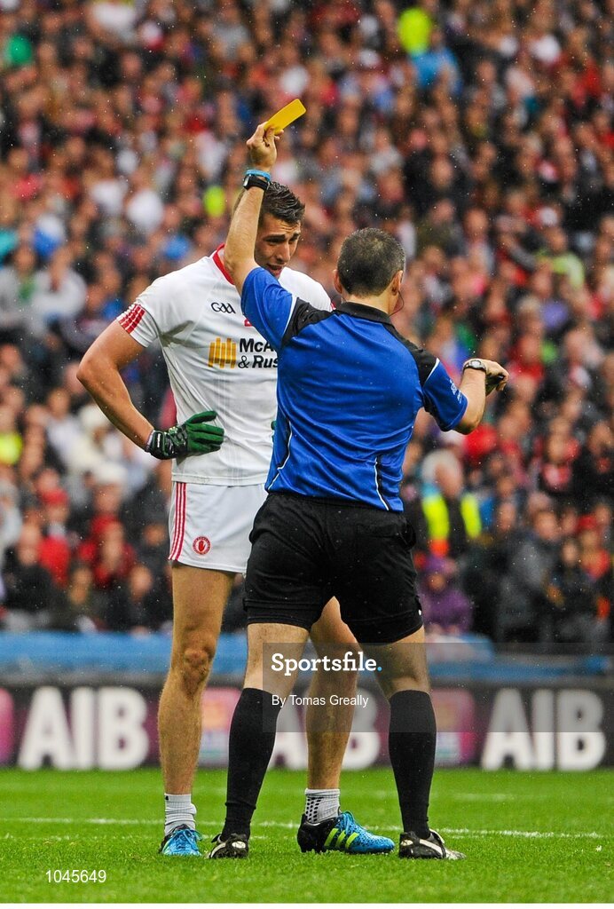 23 August 2015; Pádraig McNulty, Tyrone, is shown a yellow card by referee Maurice Degan. GAA Football All-Ireland Senior Championship, Semi-Final, Kerry v Tyrone. Croke Park, Dublin. Picture credit: Tomas Greally