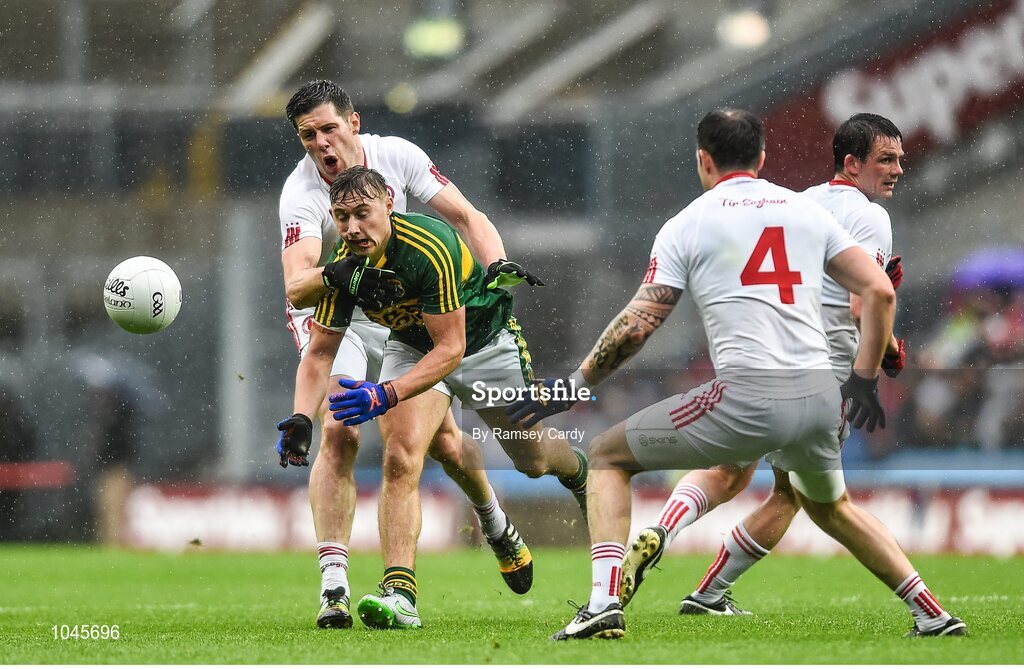 23 August 2015; James O’Donoghue, Kerry, is tackled by Sean Cavanagh, Tyrone. GAA Football All-Ireland Senior Championship, Semi-Final, Kerry v Tyrone. Croke Park, Dublin. Picture credit: Ramsey Cardy / SPORTSFILE