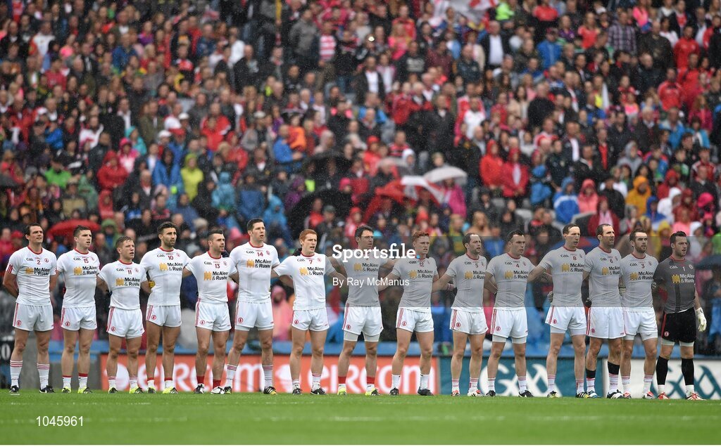 23 August 2015; The Tyrone team stand together for the national anthem. GAA Football All-Ireland Senior Championship, Semi-Final, Kerry v Tyrone. Croke Park, Dublin. Picture credit: Ray McManus / SPORTSFILE