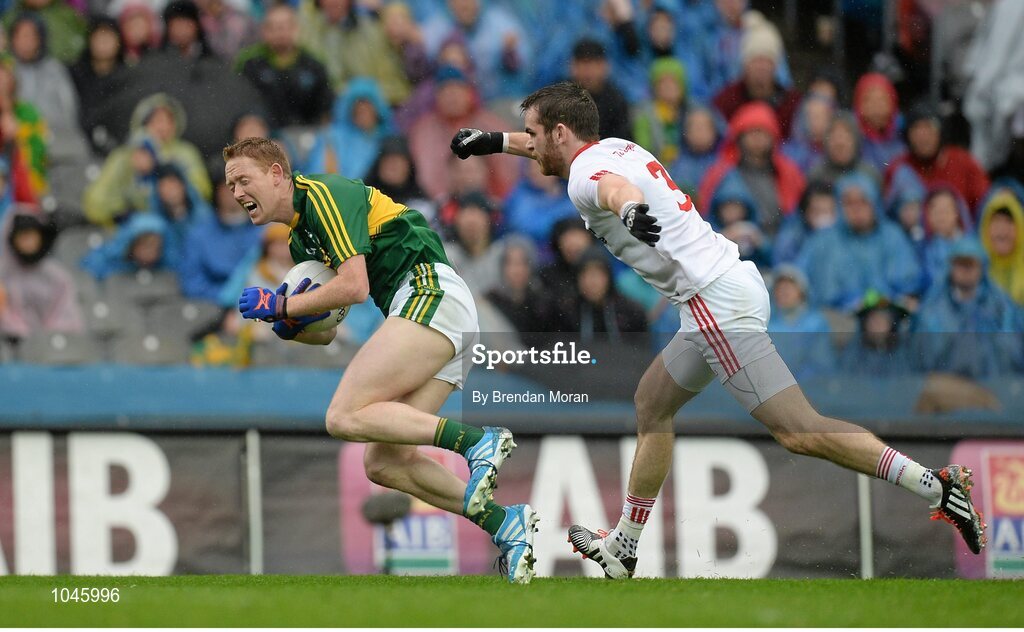 23 August 2015; Ronan McNamee, Tyrone, fouls Colm Cooper, Kerry, for which he received a black card. GAA Football All-Ireland Senior Championship, Semi-Final, Kerry v Tyrone. Croke Park, Dublin. Picture credit: Brendan Moran / SPORTSFILE