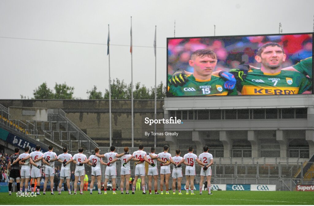 23 August 2015; The Tyrone team line out facing a big screen with Kerry players James O'Donoghue and Killian Young. GAA Football All-Ireland Senior Championship, Semi-Final, Kerry v Tyrone. Croke Park, Dublin. Picture credit: Tomás Greally / SPORTSFILE