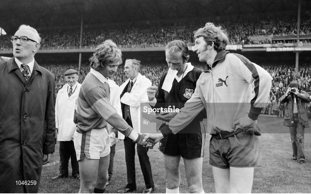 28 September 1975; Kerry captain Mickey Ned O'Sullivan, left, shakes hands with Dublin captain Sean Doherty. All-Ireland Football Final. Dublin v Kerry. Croke Park, Dublin. Picture credit: Connolly Collection / SPORTSFILE