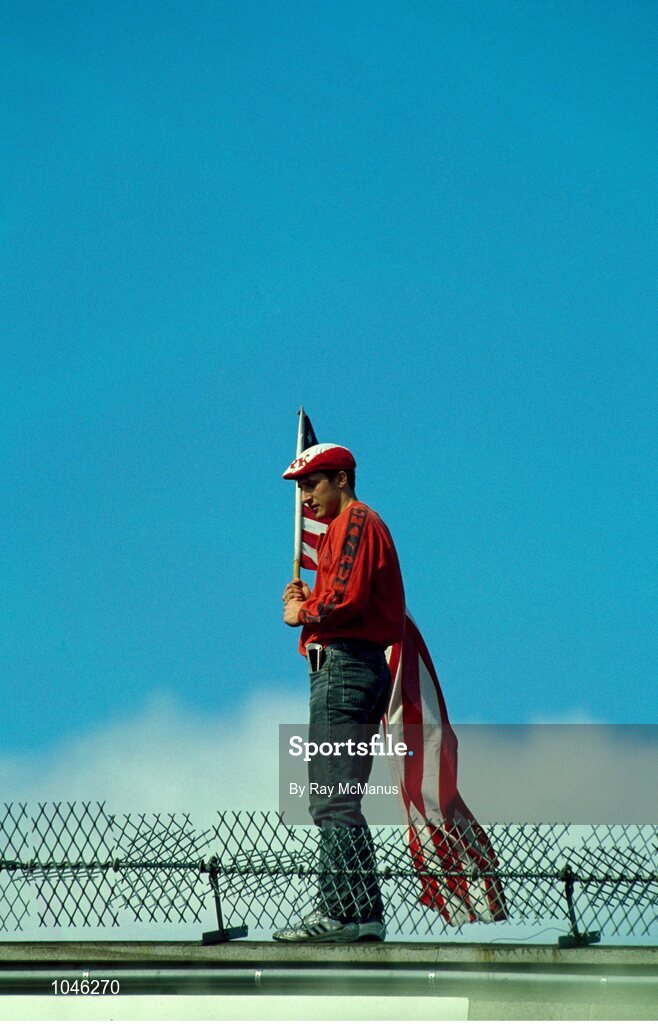 2 September 1990. A Cork supporter makes his colours visible. Cork v Galway, All-Ireland Hurling Final, Croke Park. Picture credit: Ray McManus/SPORTSFILE