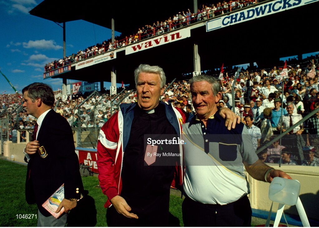 2 September 1990; Cork manager Father Michael O'Brien, left, with Galway manager Phelam Murphy after the final whistle. Cork v Galway. All-Ireland Hurling Final. Croke Park, Dublin. Picture credit: Ray McManus / SPORTSFILE
