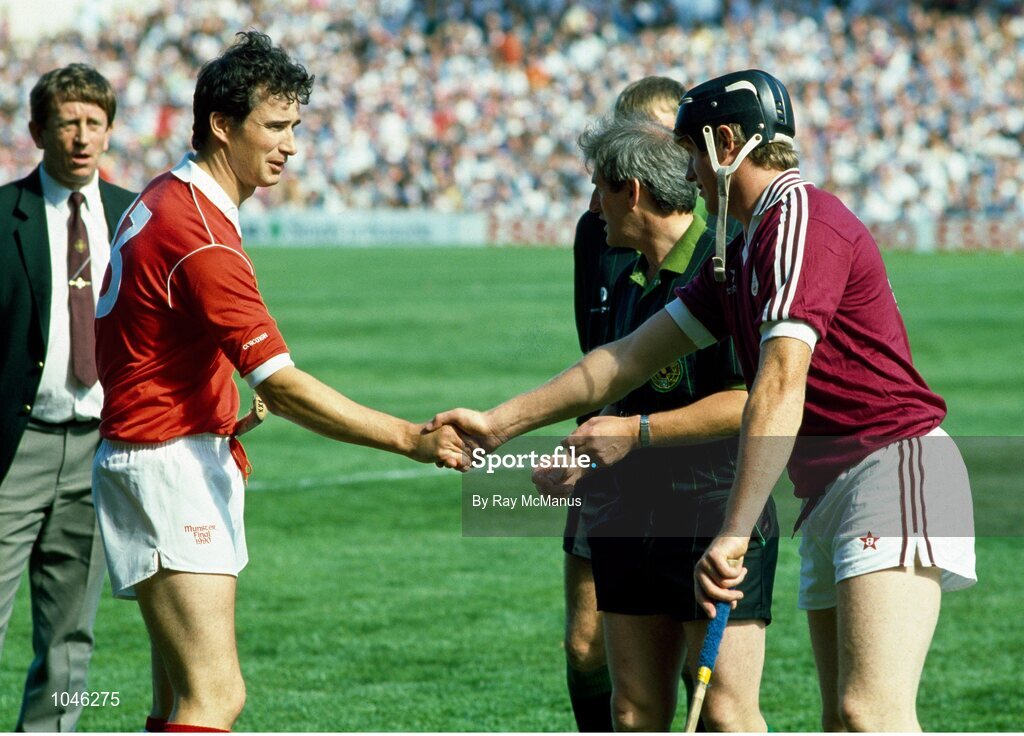 2 September 1990; Cork captain Tomás Mulcahy, left, shakes hands with Galway captain Joe Cooney in the presence of referee John Moore, Wateford. Cork v Galway, All-Ireland Hurling Final, Croke Park. Picture credit: Ray McManus / SPORTSFILE