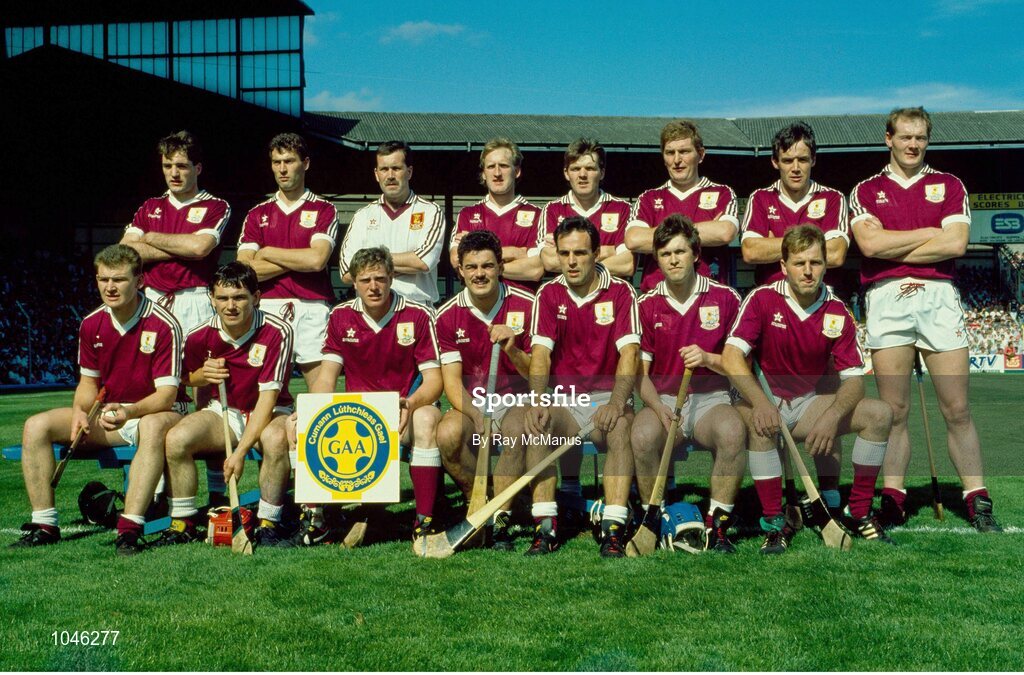 2 September 1990; The Galway hurling team, back row, left to right, Dermot Fahy, Michael Coleman, John Commins, Tony Keady, Martin Naughton, Noel Lane, Pat Malone, Sean Treacy, front row, left to right, Peter Finnerty, Michael McGrath, Joe Cooney, Gerry McInerney, Anthony Cunningham, Eanna Ryan, Ollie Kilkenny before the All-Ireland Hurling Final match between Cork and Galway at Croke Park, Dublin. Photo by Ray McManus/Sportsfile