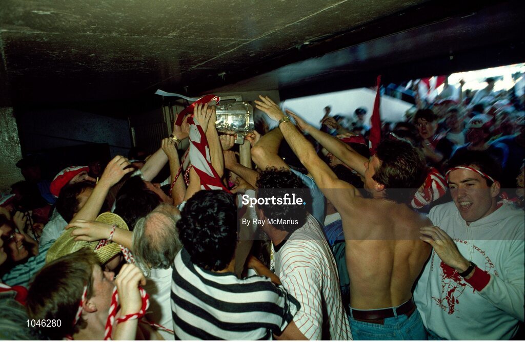 2 September 1990. Cork faithful gather around the Liam MacCarthy Cup under the Hogan Stand after Cork's victory. Cork v Galway. All-Ireland Hurling Final. Croke Park, Dublin. Picture credit: Ray McManus/SPORTSFILE