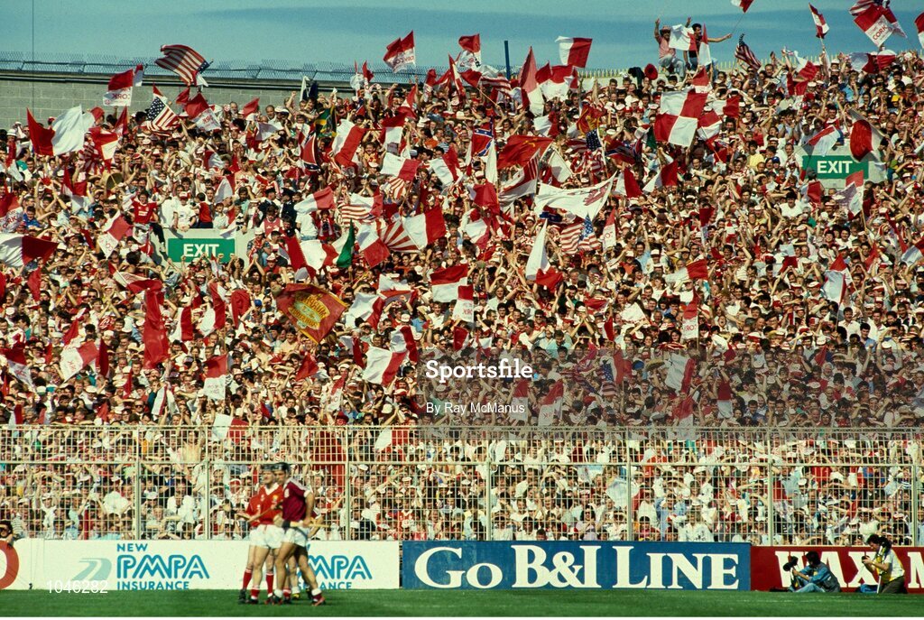 2 September 1990; Cork fans wave red and white flags on Hill 16 during the All-Ireland Senior Hurling Championship Final match between Cork and Galway at Croke Park, Dublin. Photo by Ray McManus/Sportsfile