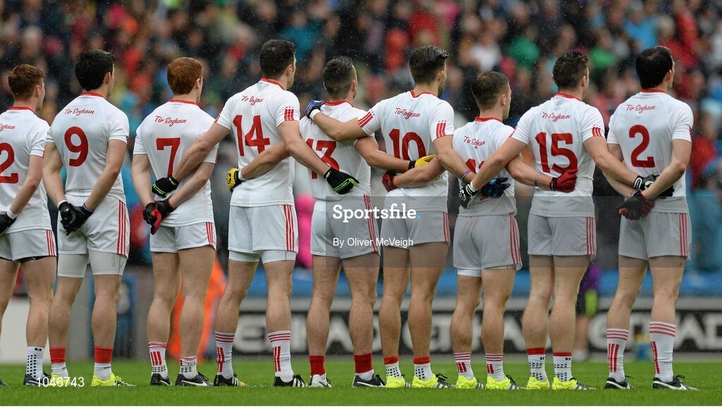 23 August 2015; The Tyrone team stand for the National Anthem. GAA Football All-Ireland Senior Championship, Semi-Final, Kerry v Tyrone. Croke Park, Dublin. Picture credit: Oliver McVeigh / SPORTSFILE