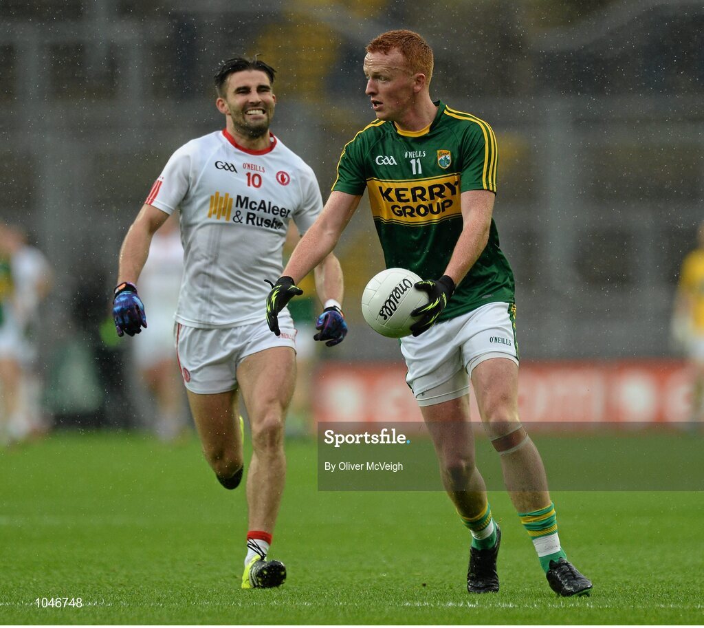23 August 2015; Johnny Buckley, Kerry, in action against Tiernan McCann, Tyrone. GAA Football All-Ireland Senior Championship, Semi-Final, Kerry v Tyrone. Croke Park, Dublin. Picture credit: Oliver McVeigh / SPORTSFILE