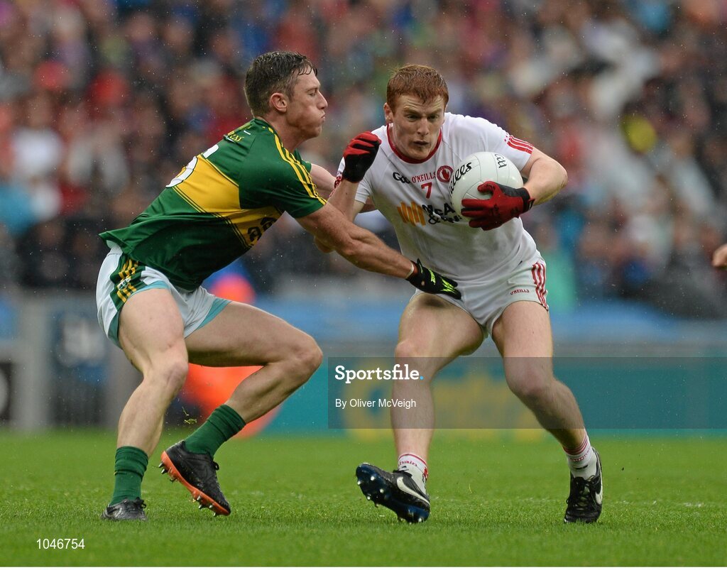 23 August 2015; Peter Harte, Tyrone, in action against Jonathan Lyne, Kerry. GAA Football All-Ireland Senior Championship, Semi-Final, Kerry v Tyrone. Croke Park, Dublin. Picture credit: Oliver McVeigh / SPORTSFILE