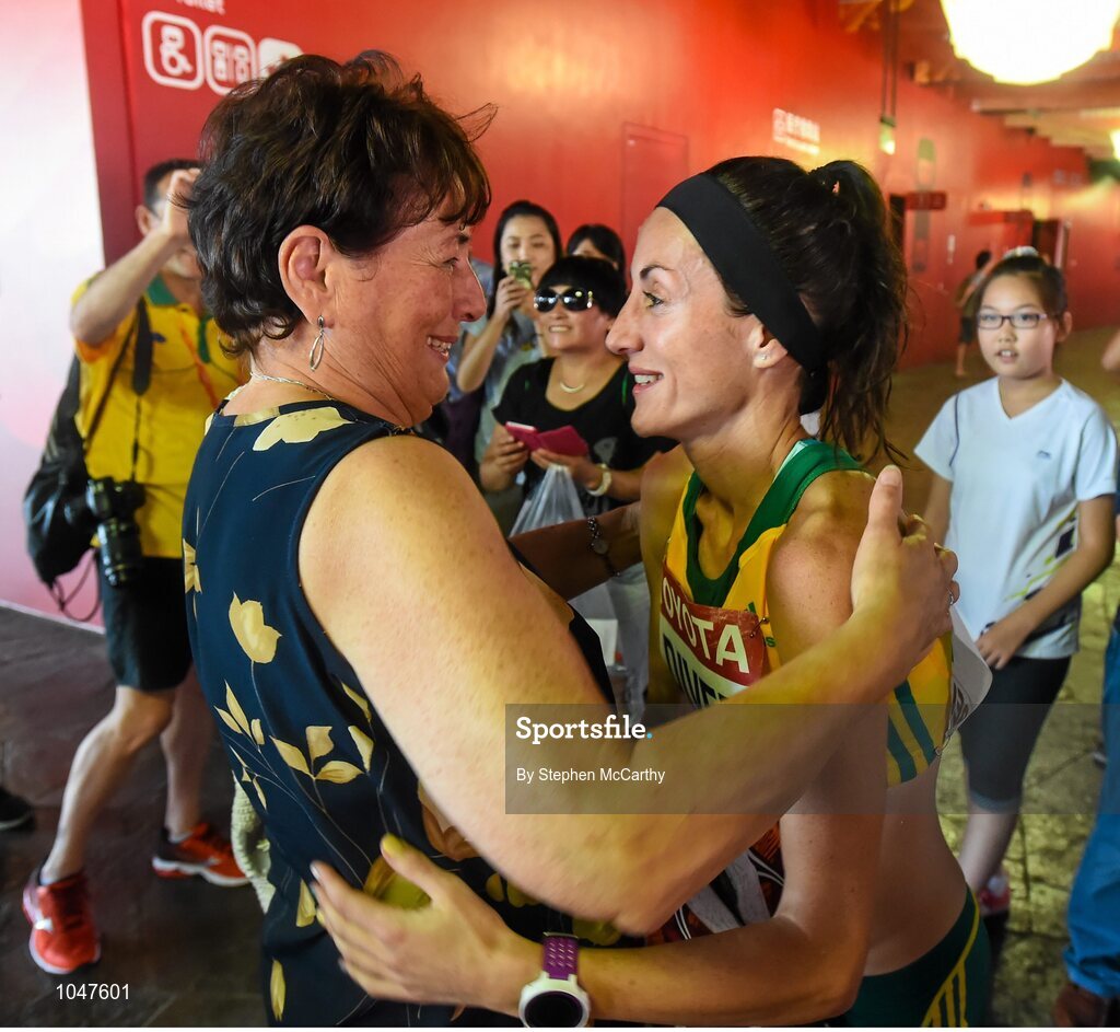 30 August 2015; Sinead Diver, from Belmullet, Co. Mayo, representing Australia, with her mother Bridie following her 21st place finish in the Women's Marathon event. IAAF World Athletics Championships Beijing 2015 - Day 9, National Stadium, Beijing, China. Picture credit: Stephen McCarthy / SPORTSFILE