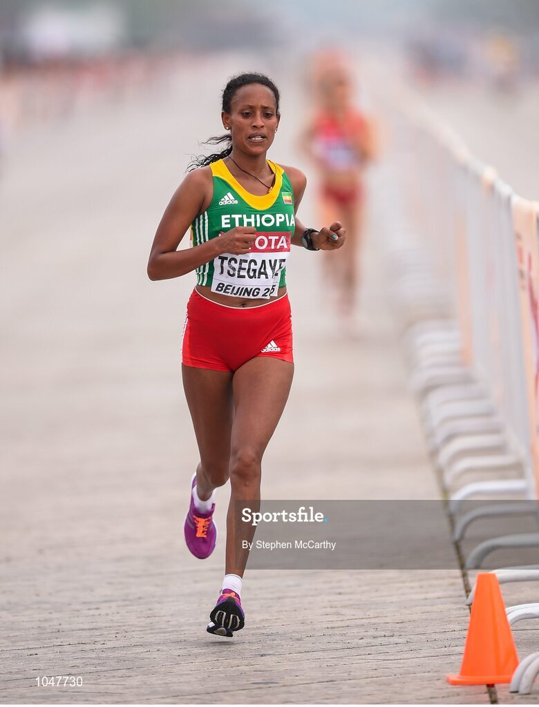 30 August 2015; Tirfi Tsegaye of Ethiopia during the Women's Marathon event. IAAF World Athletics Championships Beijing 2015 - Day 9, National Stadium, Beijing, China. Picture credit: Stephen McCarthy / SPORTSFILE