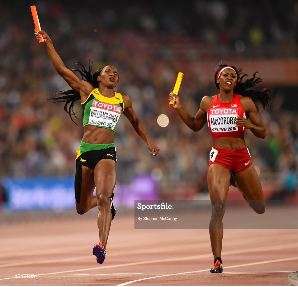 30 August 2015; Novlene Williams-Mills of Jamaica crosses the line to win gold ahead of Francena McCorory of the United States in the Women's 4x400m Relay final. IAAF World Athletics Championships Beijing 2015 - Day 9, National Stadium, Beijing, China. Picture credit: Stephen McCarthy / SPORTSFILE