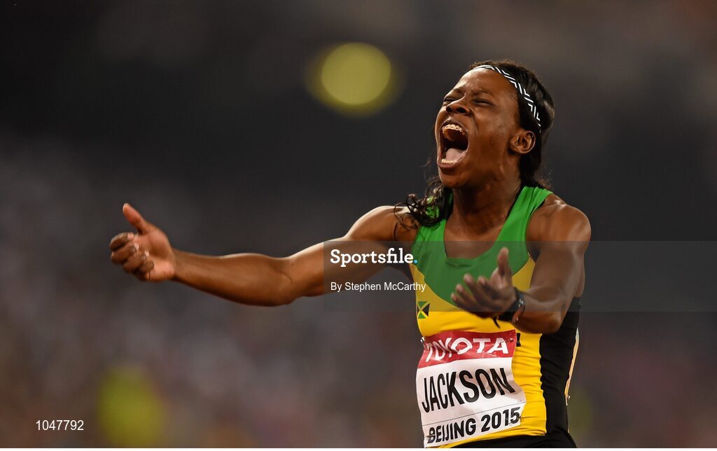30 August 2015; Shericka Jackson of Jamaica celebrates after winning the Women's 4x400m Relay final. IAAF World Athletics Championships Beijing 2015 - Day 9, National Stadium, Beijing, China. Picture credit: Stephen McCarthy / SPORTSFILE