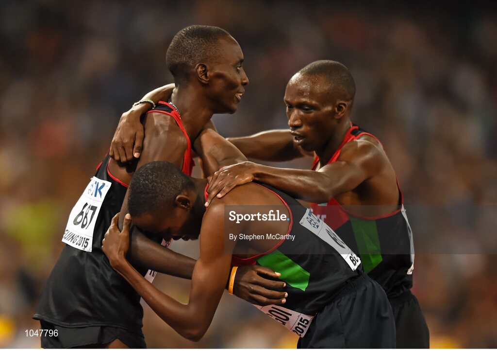 30 August 2015; Gold medalist Asbel Kiprop of Kenya, silver medalist Elijah Motonei Manangoi of Kenya and Timothy Cheruiyot of Kenya following the Men's 1500m final. IAAF World Athletics Championships Beijing 2015 - Day 9, National Stadium, Beijing, China. Picture credit: Stephen McCarthy / SPORTSFILE