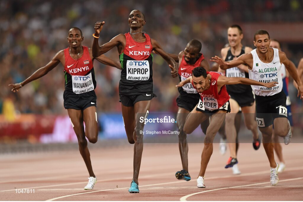 30 August 2015; Asbel Kiprop of Kenya crosses the finish line to win gold in the Men's 1500m final ahead of Elijah Motonei Manangoi of Kenya and Abdalaati Iguider of Morocco. IAAF World Athletics Championships Beijing 2015 - Day 9, National Stadium, Beijing, China. Picture credit: Stephen McCarthy / SPORTSFILE