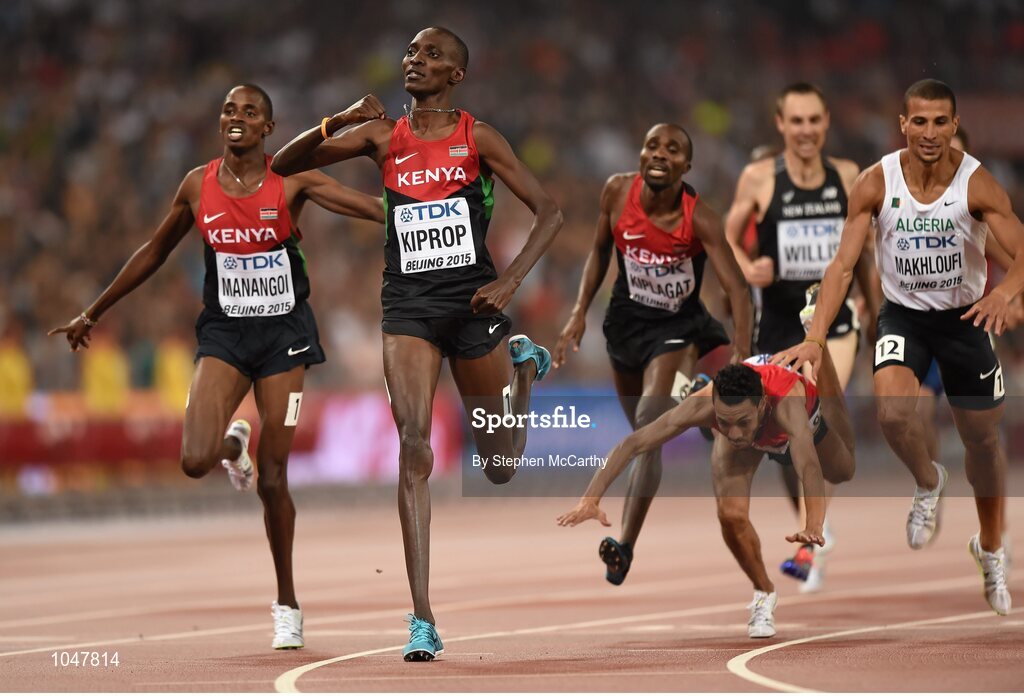 30 August 2015; Asbel Kiprop of Kenya crosses the finish line to win gold in the Men's 1500m final ahead of Elijah Motonei Manangoi of Kenya and Abdalaati Iguider of Morocco. IAAF World Athletics Championships Beijing 2015 - Day 9, National Stadium, Beijing, China. Picture credit: Stephen McCarthy / SPORTSFILE