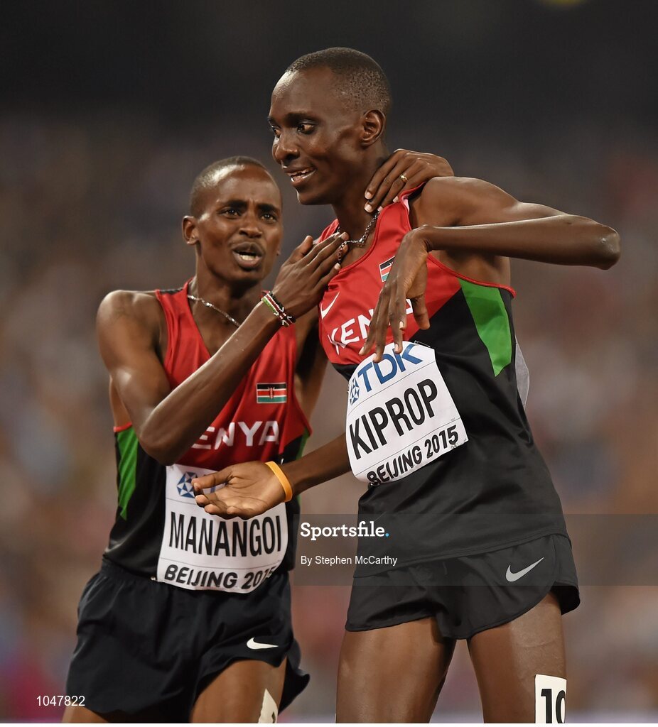 30 August 2015; Asbel Kiprop of Kenya crosses the finish line to win gold in the Men's 1500m final ahead of Elijah Motonei Manangoi of Kenya. IAAF World Athletics Championships Beijing 2015 - Day 9, National Stadium, Beijing, China. Picture credit: Stephen McCarthy / SPORTSFILE